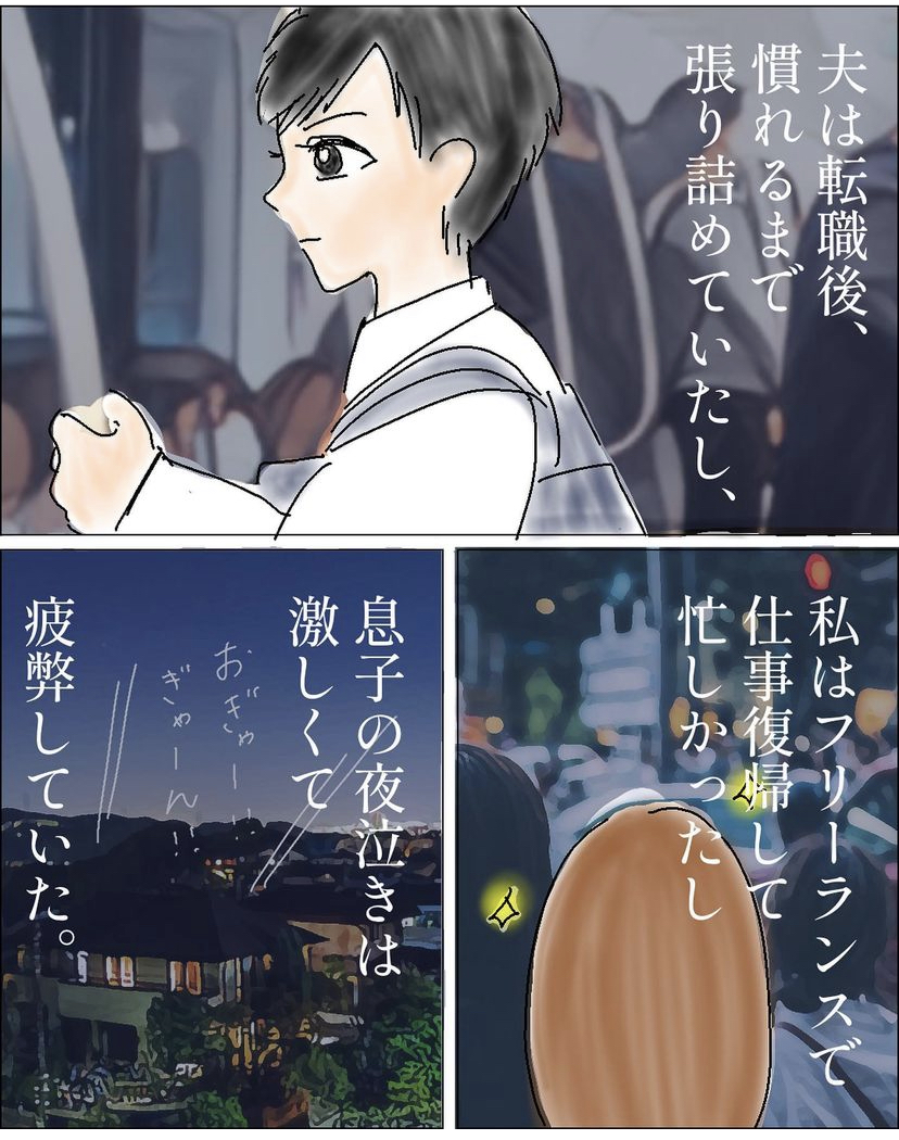 私はこの影響を強く感じていました。多くの男性は、赤ちゃんが泣いても寝ていると聞いていたのですが、我が家の場合は夫もやはり、睡眠が断続的になっていたこと、また、転職したてで、疲労困憊な日々でした。